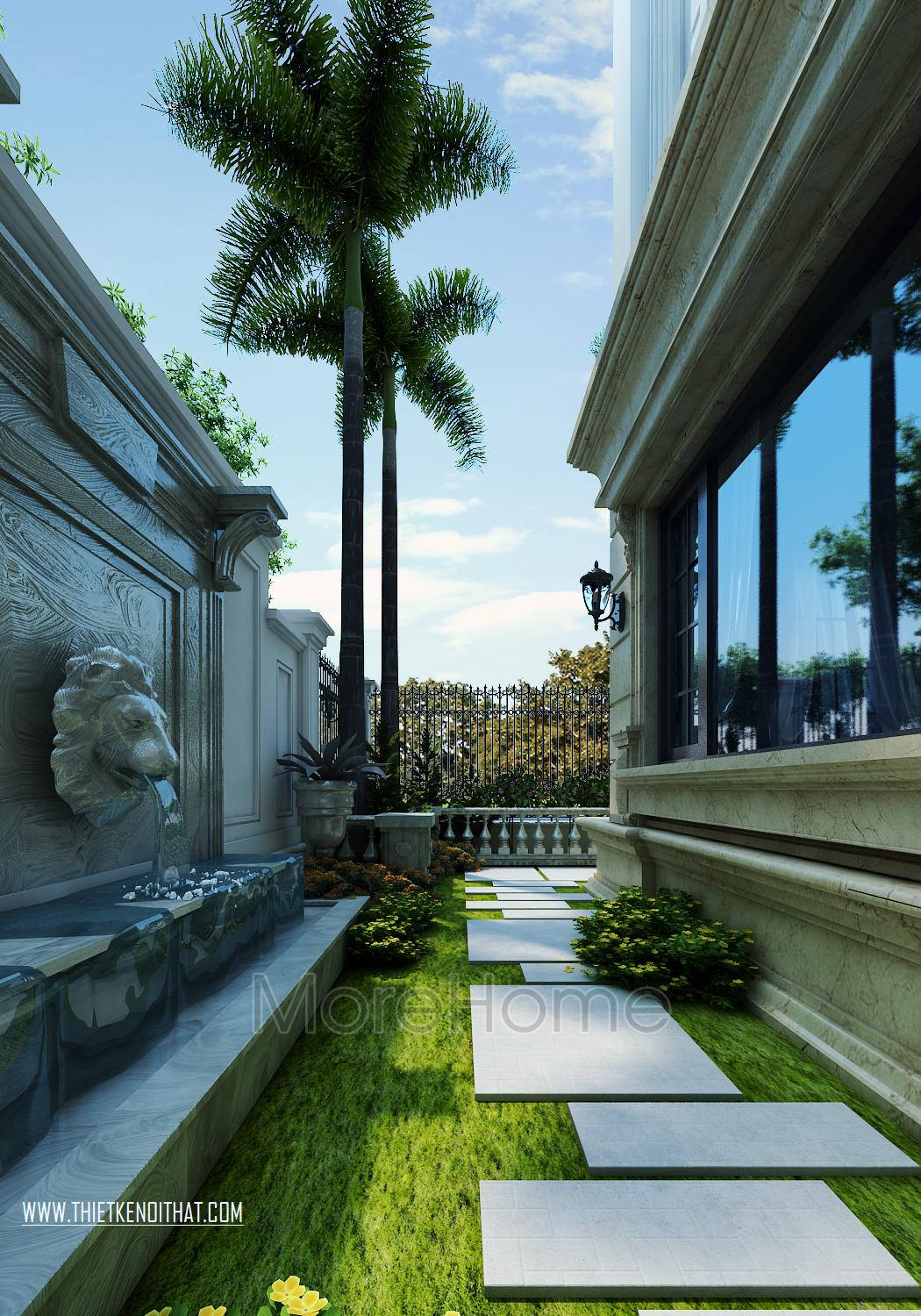Đây là một mẫu thiết kế biệt thự đẹp, có kiến trúc vô cùng độc đáo và khác biệt. Lối đi được trồng cỏ nhật và hoa, lát những viên đá lớn mài nhẵn bề mặt. Bức tường không còn đơn điệu mà được trang trí họa tiết đầu sư tử rất uy nghi, miệng phun nước, giống như một bức tranh.
