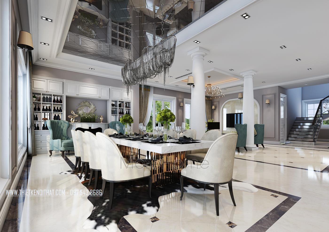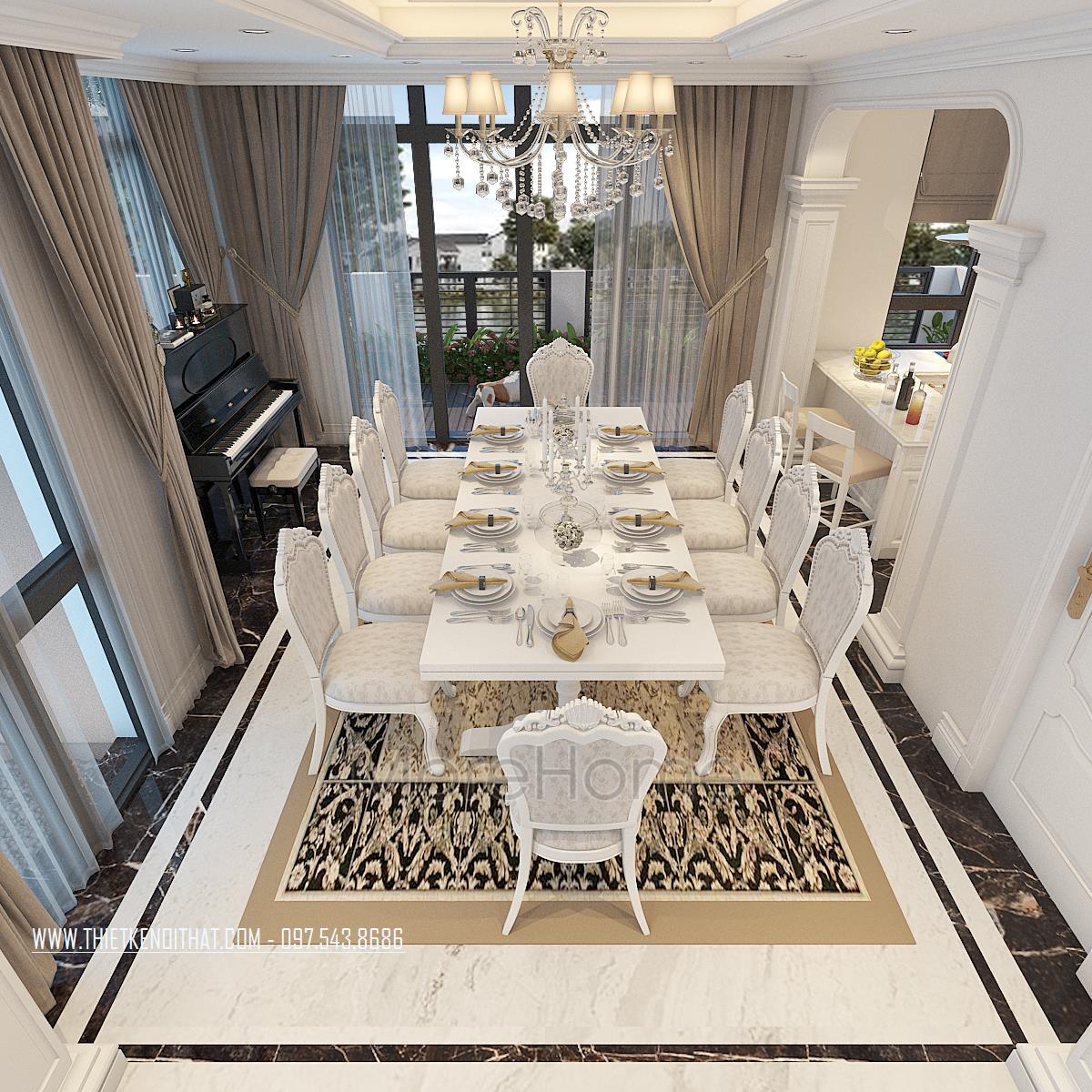 Nội thất phòng ăn mang hơi thở châu Âu, toát lên nét hào hoa và sang trọng. Từ chiếc đèn chùm cầu kỳ, đến những chiếc ghế nệm, tấm thảm hay bộ đồ ăn đều nói lên sự đẳng cấp và quý phái. Nhiều người sẽ cho rằng đặt piano ở phòng ăn là bất hợp lý. Tuy nhiên nếu hiểu về phương Tây, bạn sẽ thấy họ rất thích thưởng thức âm nhạc trong bữa ăn. Chính vì vậy, chiếc piano ở đây cũng có một nhiệm vụ quan trọng, như một món ăn trong thực đơn của bàn tiệc.