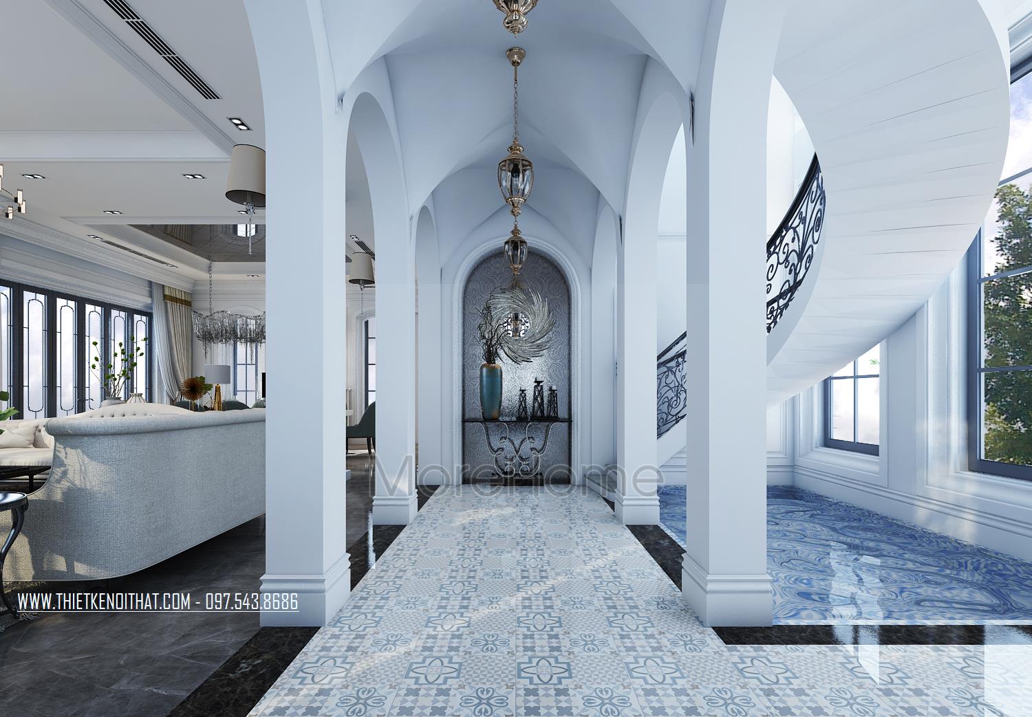 Có thể nói Morehome là đơn vị có những thiết kế kiến trúc rất mới lạ và sáng tạo. Điều đó thể hiện ở không gian của một mẫu nội thất dinh thự có màu chủ đạo là trắng pha xanh dương nhẹ, mang đến một cảm giác biển cả và mênh mang. Ấn tượng nhất là chiếc cầu thang uốn lượn ngay bên trên một chiếc hồ nhỏ ở dưới. Kết hợp cùng với ánh sáng tự nhiên, làn nước đã tạo nên một ánh sáng lấp lánh, mang đến cho gian phòng sự tươi mới và rạng ngời.