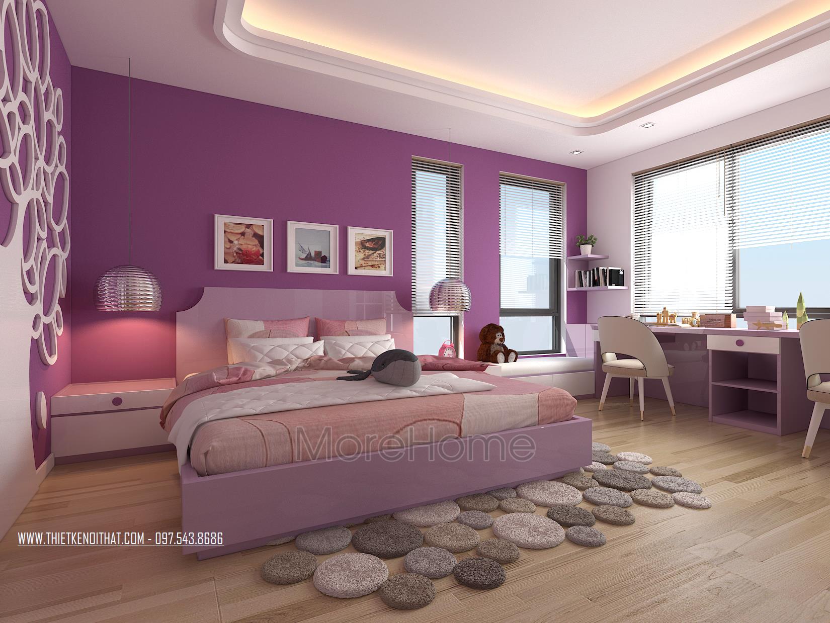 Nhìn nội thất phòng ngủ này chắc chắn bạn sẽ đoán ngay ra là phòng ngủ của một cô gái dễ thương. Gam màu tím hồng nữ tính và ngọt ngào xuất hiện trong hầu hết các vật dụng như sơn tường, giường, gối đệm, tủ, bàn… chỉ khác nhau về tông đậm, nhạt. Đây là những mẫu nội thất biệt thự phòng ngủ mang phong cách hiện đại, trẻ trung, có màu sắc nổi bật rất phù hợp với những chủ nhân cá tính.
