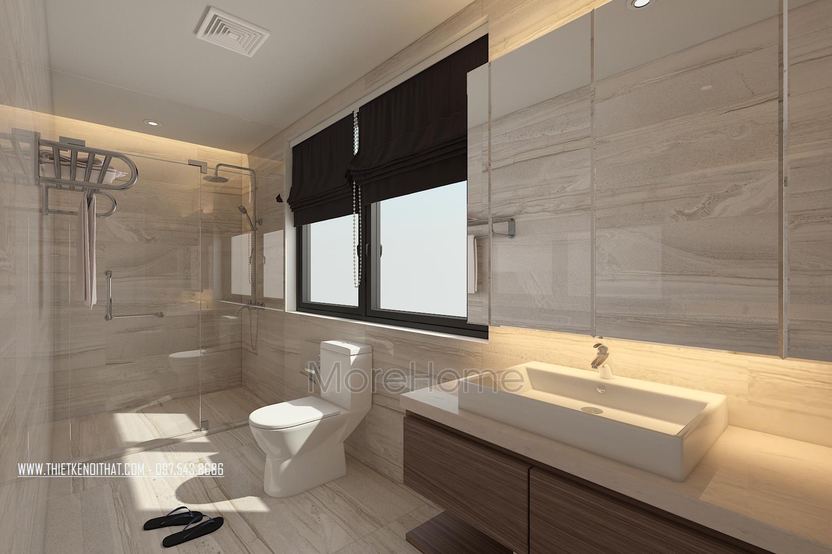 Phòng tắm kết hợp phòng vệ sinh được lát gạch giả vân gỗ, mang lại sự tự nhiên và tiết chế lại cảm giác lạnh lẽo. Nếu như toilet thông thường không có tủ tường thì trong thiết kế này tủ tường lại khá lớn, có rất nhiều công dụng. Bạn có thể sử dụng tủ để đặt quần áo, khăn tắm, các chai lọ, bàn chải… cho gọn gàng. Đáng chú ý nhất là toilet có cửa sổ lớn, giúp ánh nắng chiếu vào làm nền nhà luôn khô ráo, không bị trơn trượt.