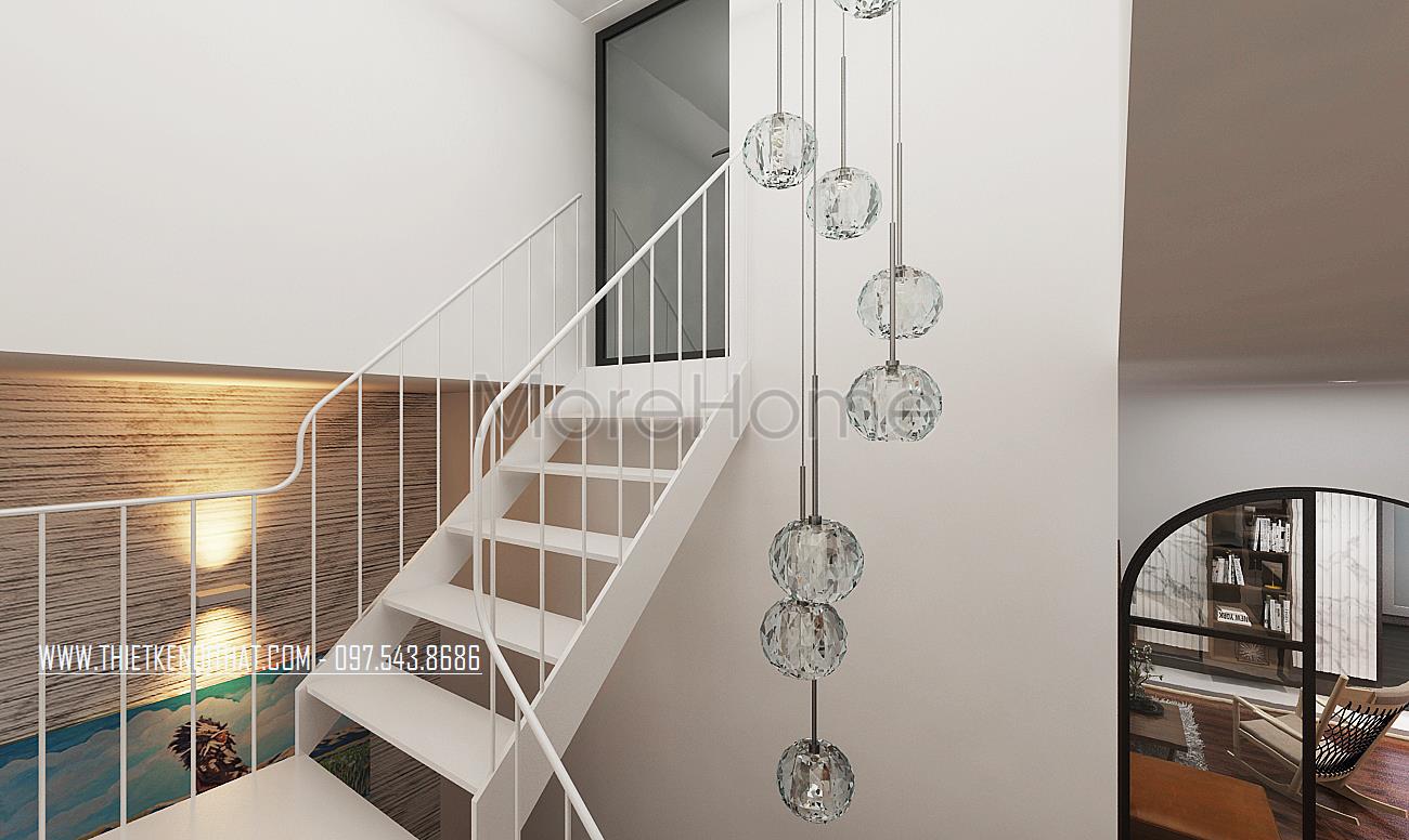Cầu thang trắng rất đơn giản và trông có vẻ mảnh mai nhưng thực ra lại rất chắc chắn. Để chiếc cầu thang không còn đơn điệu, Morehome đã thiết kế thêm những quả cầu trong suốt rủ dài xuống dưới. Khi kết hợp với ánh đèn, những quả cầu trong suốt sẽ phản chiếu ra ánh sáng rất đẹp và lung linh.